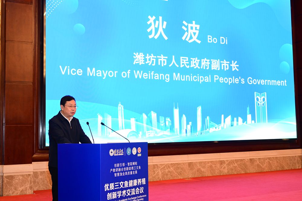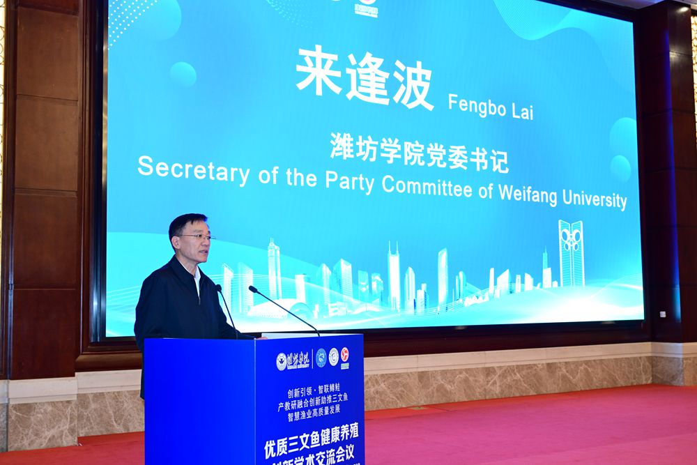 本网讯 10月25日至26日,学校举办优质三文鱼健康养殖创新学术交流会。潍坊市人民政府党组成员、副市长狄波,学校党委书记来逢波出席开幕式并致辞。开幕式由学校党委委员、副校长李英德主持。