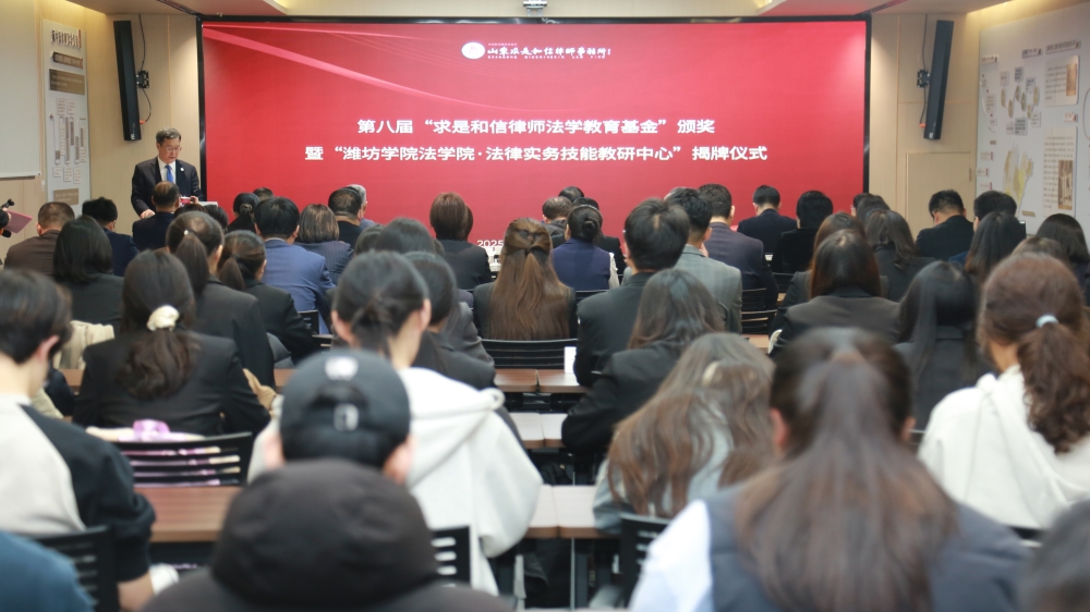 本网讯 10月31日,第八届“求是和信律师法学教育基金”颁奖暨“潍坊学院法学院・法律实务技能教研中心”揭牌仪式在求是大厦举行。学校党委委员、副校长王成端,山东求是和信律师事务所党支部书记、主任马东宁出席活动。