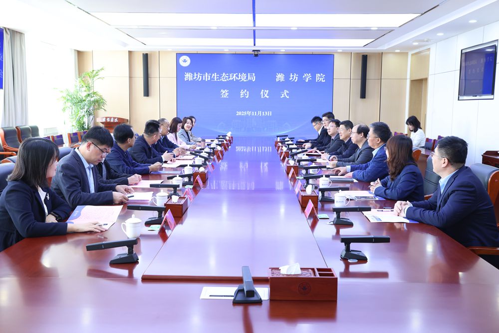 本网讯 11月13日,学校与潍坊市生态环境局合作签约仪式在校举行。学校党委副书记王守全致辞,学校党委委员、副校长李英德,潍坊市生态环境局党组书记、局长邹晓东,潍坊市生态环境局党组副书记、副局长孟建明出席活动。