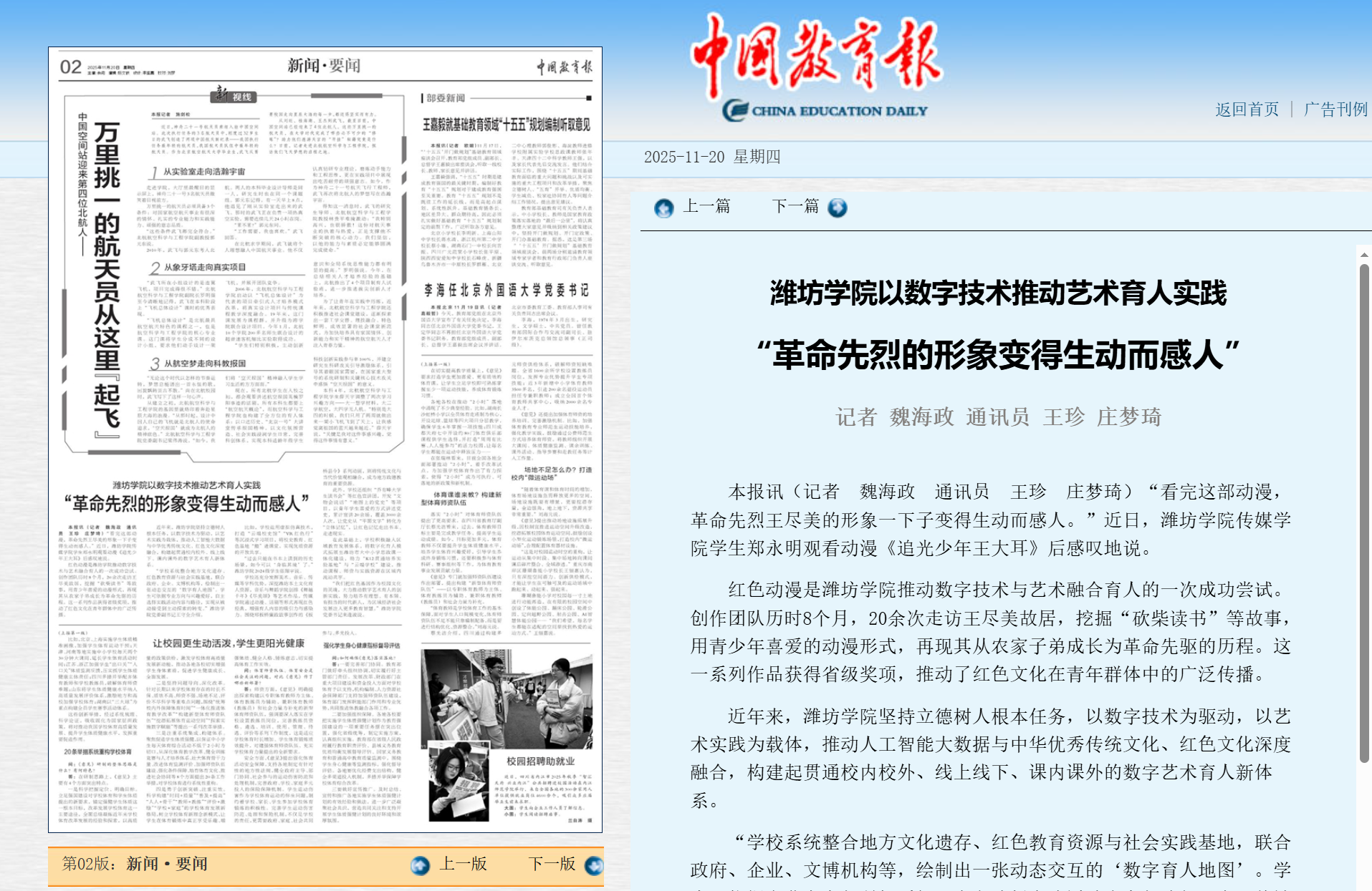 本网讯 11月20日,《中国教育报》以《潍坊学院以数字技术推动艺术育人实践——“革命先烈的形象变得生动而感人”》为题,对学校在数字技术赋能艺术育人实践方面的做法进行了报道。