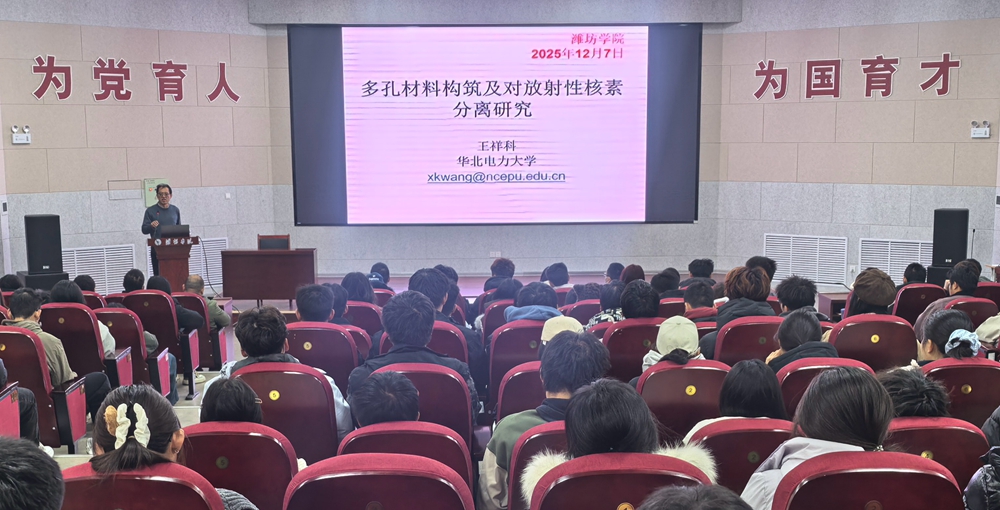 报告中,王祥科以《多孔材料构筑及对放射性核素分离研究》为题,从国家核能发展的现实需求切入,介绍了核能发展引起的多个问题以及解决方法——通过调控多孔材料的错位堆积结构,激活“沉睡”的功能位点,使材料对放射性核素的分离性能提升数倍。针对核污染的现实危害以及贫铀弹带来的长期生态风险,强调“核环境安全是核事业的生命线”。他结合现实生活重点介绍了团队开发的吸附光催化、电催化等技术在复杂环境中进行铀的选择提取与处理医院放射性碘治疗产生的特殊废弃物多个方面的应用,让同学们对相关技术操作方面有了清晰的了解。