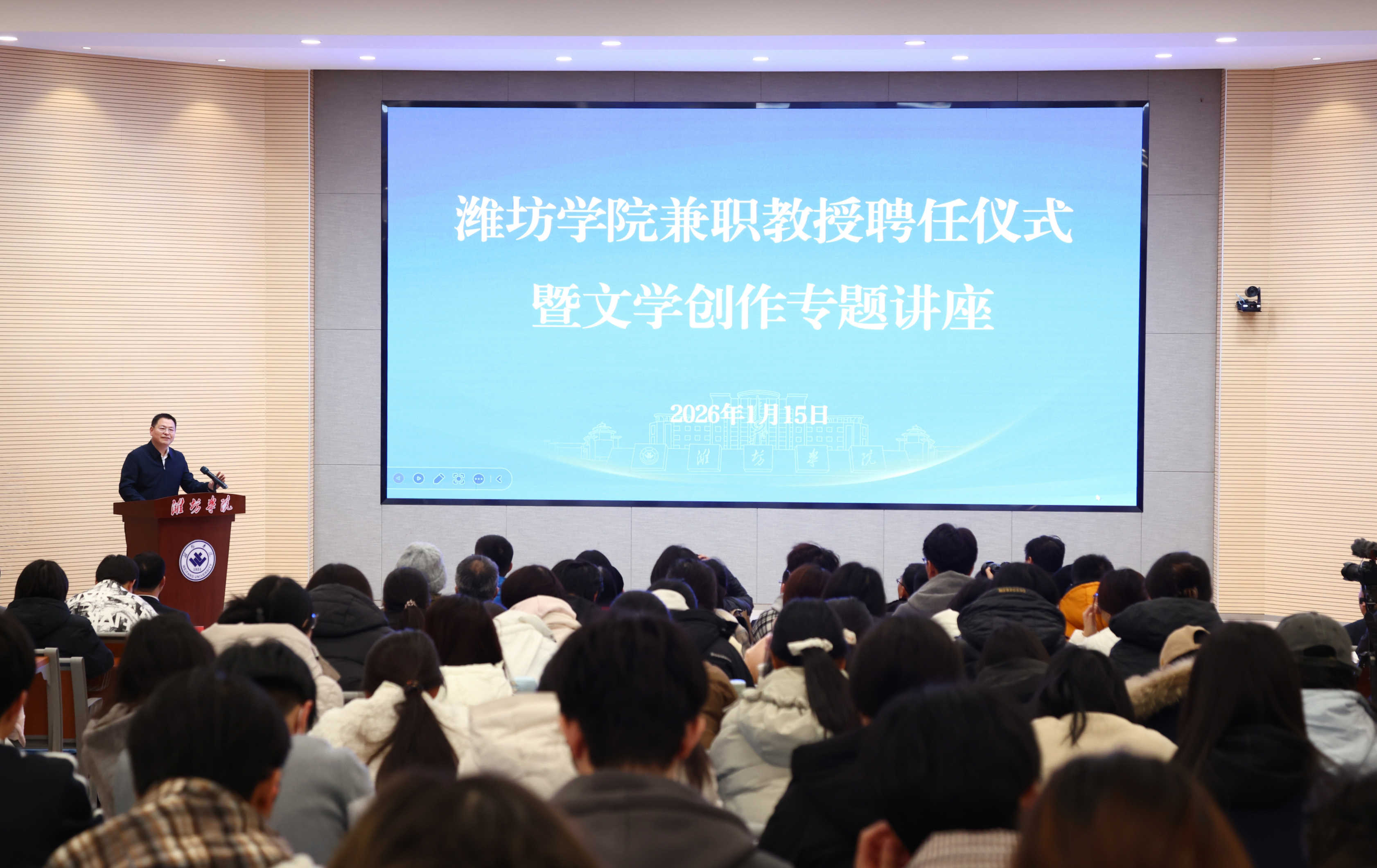 本网讯 1月15日,学校举行兼职教授聘任仪式暨文学创作专题讲座活动。潍坊市委常委、宣传部部长杨建华,学校党委书记来逢波,党委副书记、校长王霞,潍坊市文化和旅游局党组书记、局长高强,潍坊市文学艺术界联合会副主席范德祥,中国作家协会会员、山东省作协全委会委员、潍坊市政协委员王威,中国作家协会会员、山东作协全委会委员、诸城市作家协会主席黄鑫出席活动,学校党委委员、副校长任立春主持活动。