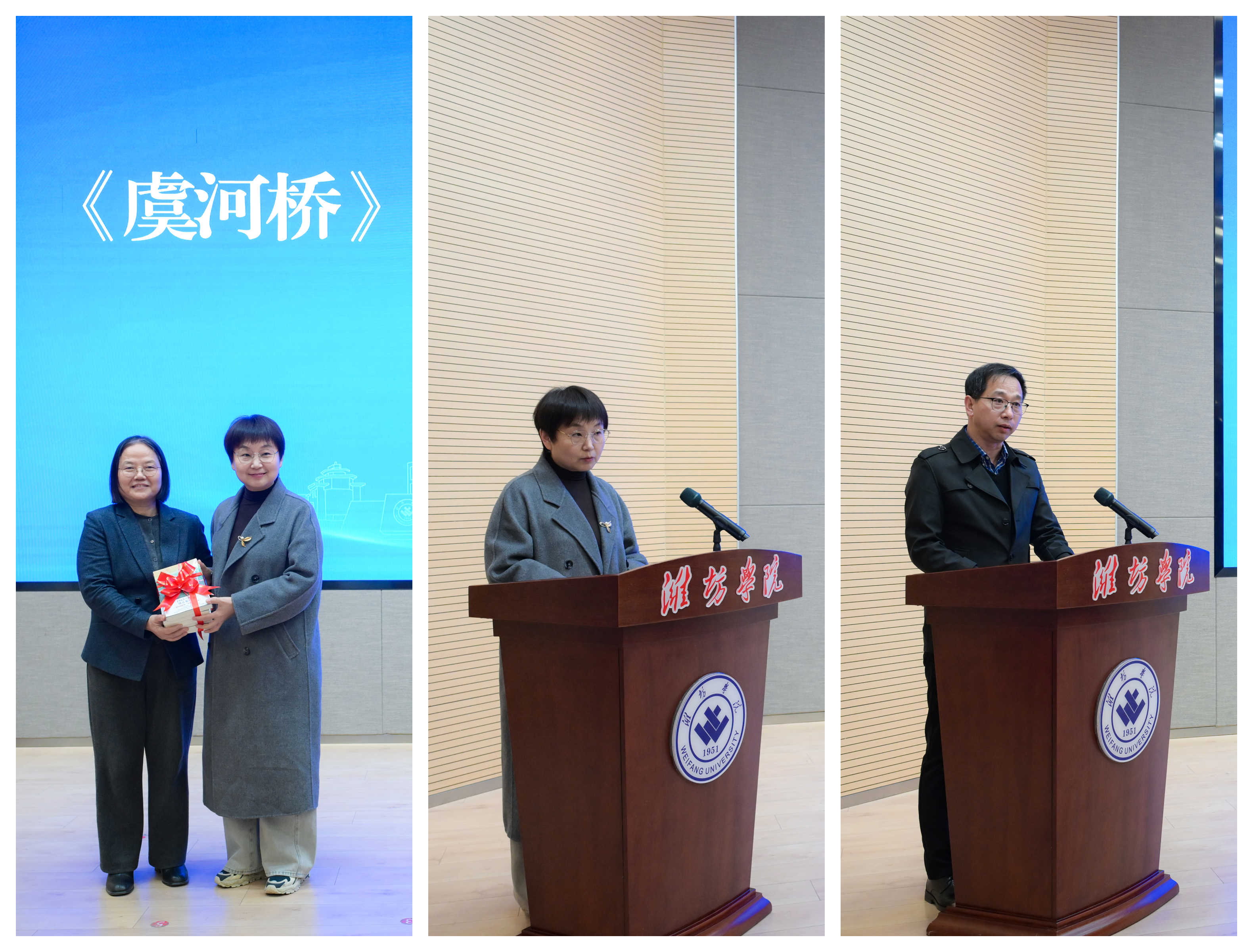 仪式上,王霞为王威、黄鑫颁发潍坊学院兼职教授聘书。两位作家分别发布了“非遗主题长篇小说创作计划”和“东风暖”系列长篇小说创作计划。王威向学校图书馆捐赠了《虞河桥》《远处传来谁的歌声》等书籍。