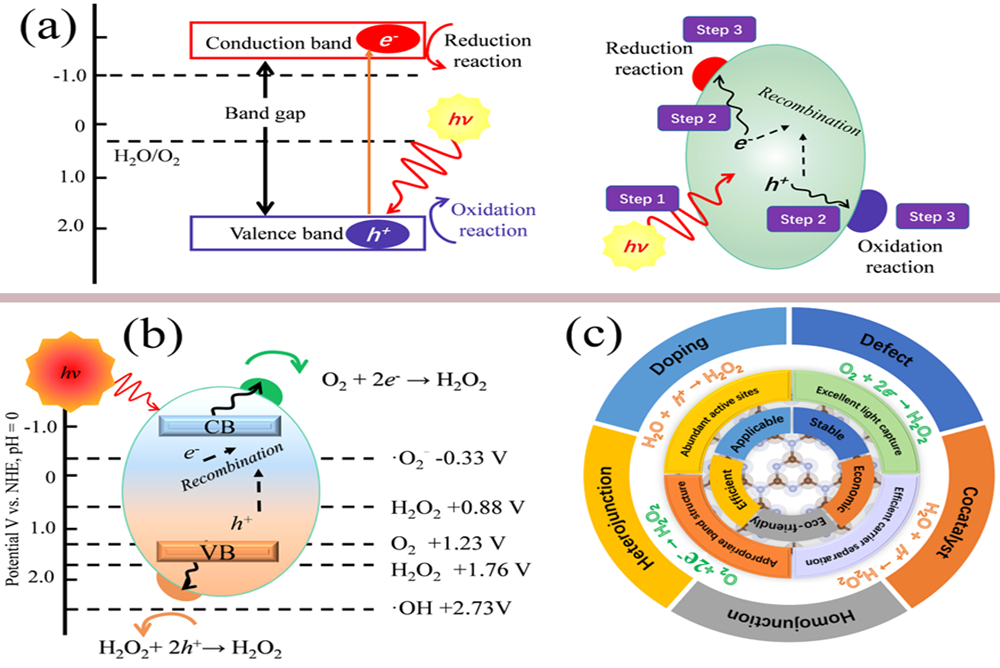 石墨相氮化碳(g-C3N4)因其独特的二维层状结构、可见光响应、非金属特性及可调的电子性质,在光催化H2O2合成领域受到广泛关注,成为近年来的研究热点。然而,原始g-C3N4的应用受到其有限的可见光吸收、光生载流子易复合、表面催化活性低等固有缺陷的限制。基于此,论文系统讲解了提升g-C3N4基材料光催化H2O2生成效率的改性策略,深入探讨了其增强机制,并对该领域面临的挑战和未来发展进行了展望。