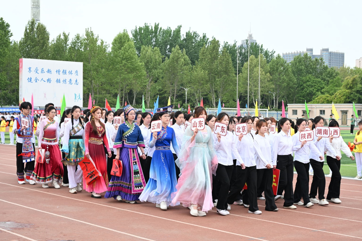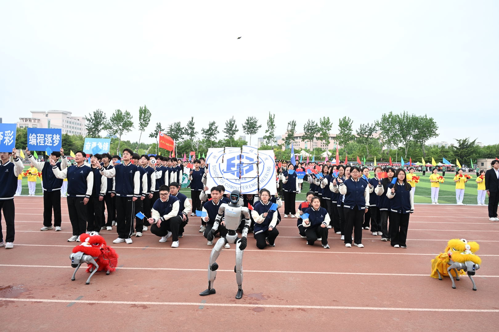 上午8时,入场仪式开始。国旗校旗护卫队、花束方队与彩旗方队率先入场,裁判员方队、19个学院方队及校友方队依次亮相。各学院方队紧扣专业主题,通过创意标识、响亮口号和特色展示,展现学科底蕴与学生创新思维。校友方队由各届毕业生代表组成,身着统一服装,传递与母校同心同行的情怀。