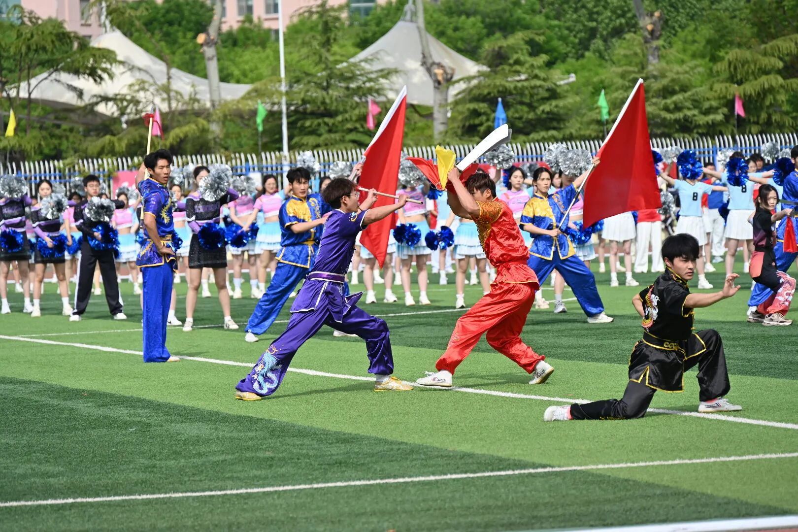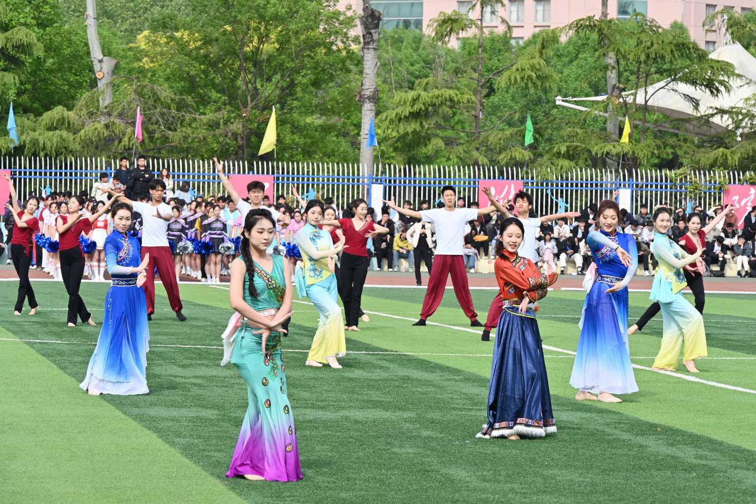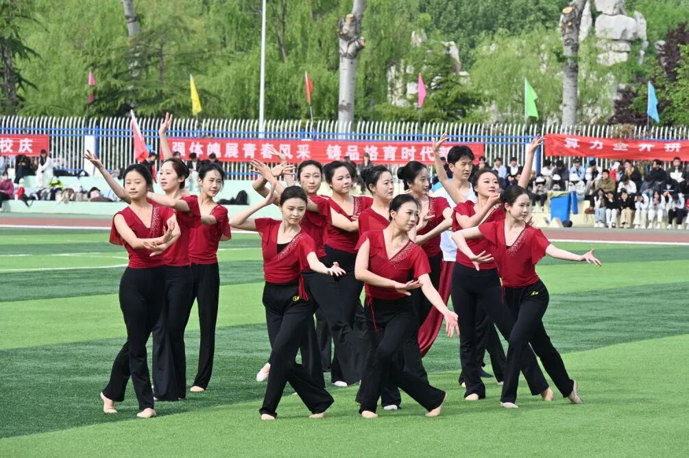 开幕式后举行了团体展演。音乐与舞蹈学院85名学生表演节目《雅韵风华 民族同辉》,刚柔并济间彰显中华文化底蕴。来自19个学院的475名学生组成方队,进行大型团体操展演《潍我自信 逐梦向前》。伴随着欢快旋律,各方阵缓缓聚拢、默契联动,最终定格为潍坊学院校标造型,象征全体学子同心向校、自信自强。