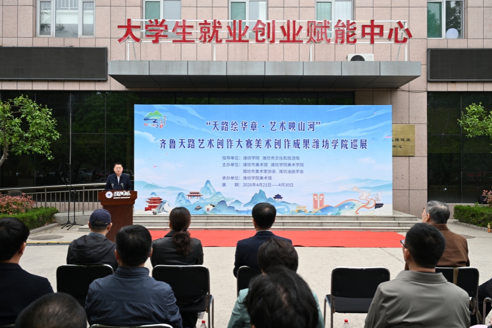 本网讯 4月21日,“天路绘华章・艺术映山河”齐鲁天路艺术创作大赛美术创作成果展潍坊学院巡展暨大学生科技文化艺术节齐鲁天路诗词大赛开幕式在学校举行。学校党委委员、副校长任立春出席并致辞。学校党委委员、宣传部部长张晓静,潍坊市文化和旅游局、潍坊市美术馆、潍坊油画学会、潍坊市美术家协会等单位嘉宾出席开幕式。