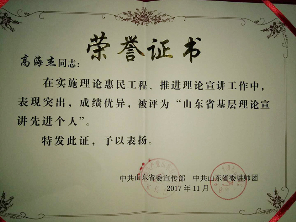 近日,我校马克思主义学院高海杰老师,在实施理论惠民工程、推进理论宣讲工作中表现突出,成绩优异,被山东省委宣传部评为“山东省基层理论宣讲先进个人”。