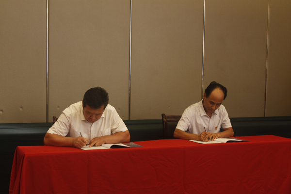 本网讯 9月14日,潍坊学院党外高层次人才民企挂职暨潍坊民营经济发展研究中心揭牌仪式在我校体育馆会议室举行。潍坊市委常委、统战部长王兆辉出席会议并讲话;学校党委书记孙文亮和市政协副主席、工商联主席李士来共同为“潍坊民营经济发展研究中心”揭牌;学校党委统战部长徐树芝和市工商联副主席郭富斌签订“潍坊学院与潍坊市工商联校企联姻协议”;市委统战部常务副部长王志明,市委统战部副部长、市工商联党组书记胡立出席会议。